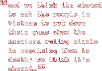 | The Black Panther party had directly opposed the involvement of Black men in the Vietnam War in the Ten-Point Platform. As it states: "We want all Black men to be exempt from military service. We believe that Black people should not be forced to fight in the military service to defend a racist government that does not protect us. We will not fight and kill other people of color in the world who, like Black people, are being victimized by the White racist government of America." |